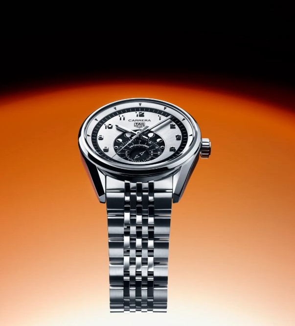 The first watch, part of the core TAG Heuer Carrera collection, brings clarity and bold contrast through a stainless-steel construction paired with a silver dial. Its black flange and black moonphase disc evoke the stillness of space, while deep grey detailing adds a sense of movement and atmosphere. The rhodium-plated hands are coated with white Super-LumiNova® for optimum legibility. The bracelet, a modern interpretation of the Maison’s iconic beads of rice design from the 1960s, connects the perfect fake TAG Heuer watches to TAG Heuer’s history of elegance with purpose. Its visual weight and fluidity of form create a confident, grounded silhouette.