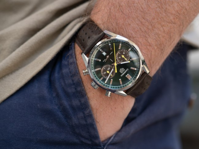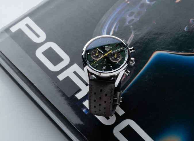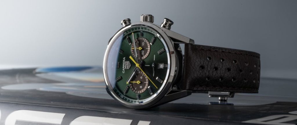 Maybe I’m a bit biased after seeing a short video clip that was shared alongside the press pictures of the new TAG Heuer Carrera Chronograph European Limited Edition. In it, a green, a yellow, and a gray Porsche 911 seem to be racing each other on a twisty mountain road. I just assume the drivers are all sitting in plush brown leather bucket seats and wearing yellow-framed sunglasses. Anyway, let’s take a look at this new green-dial TAG Heuer Carrera Chronograph European Limited Edition.